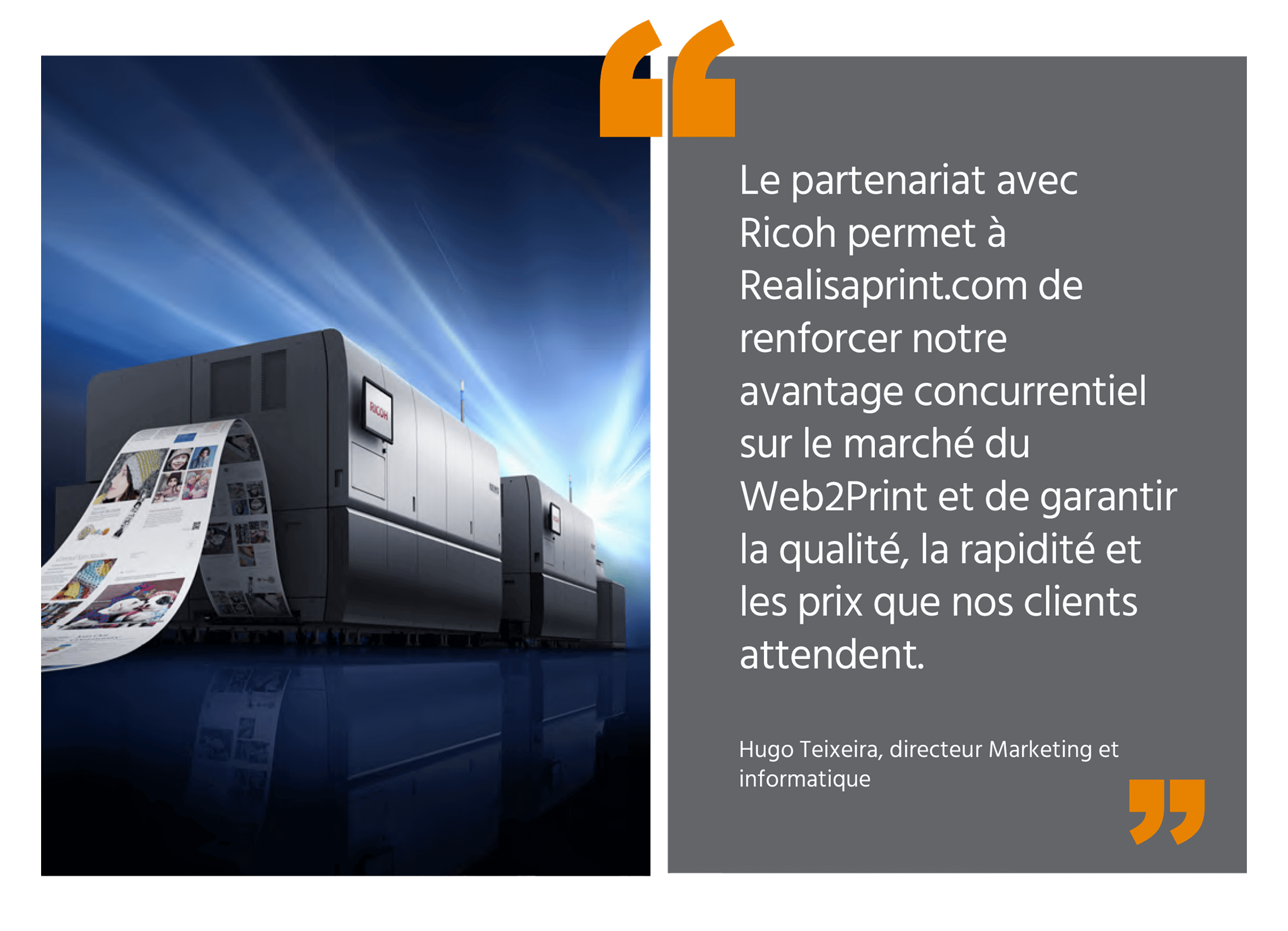 « En tant que fournisseur mondialement reconnu, Ricoh peut nous aider à relever les défis de demain avec une large gamme de produits pour soutenir notre croissance. Nous avons été impressionnés par notre première presse numérique feuille à feuille ProTM C9200, nous avons donc eu confiance dans le matériel et les services d’alimentation continue proposés par Ricoh ».